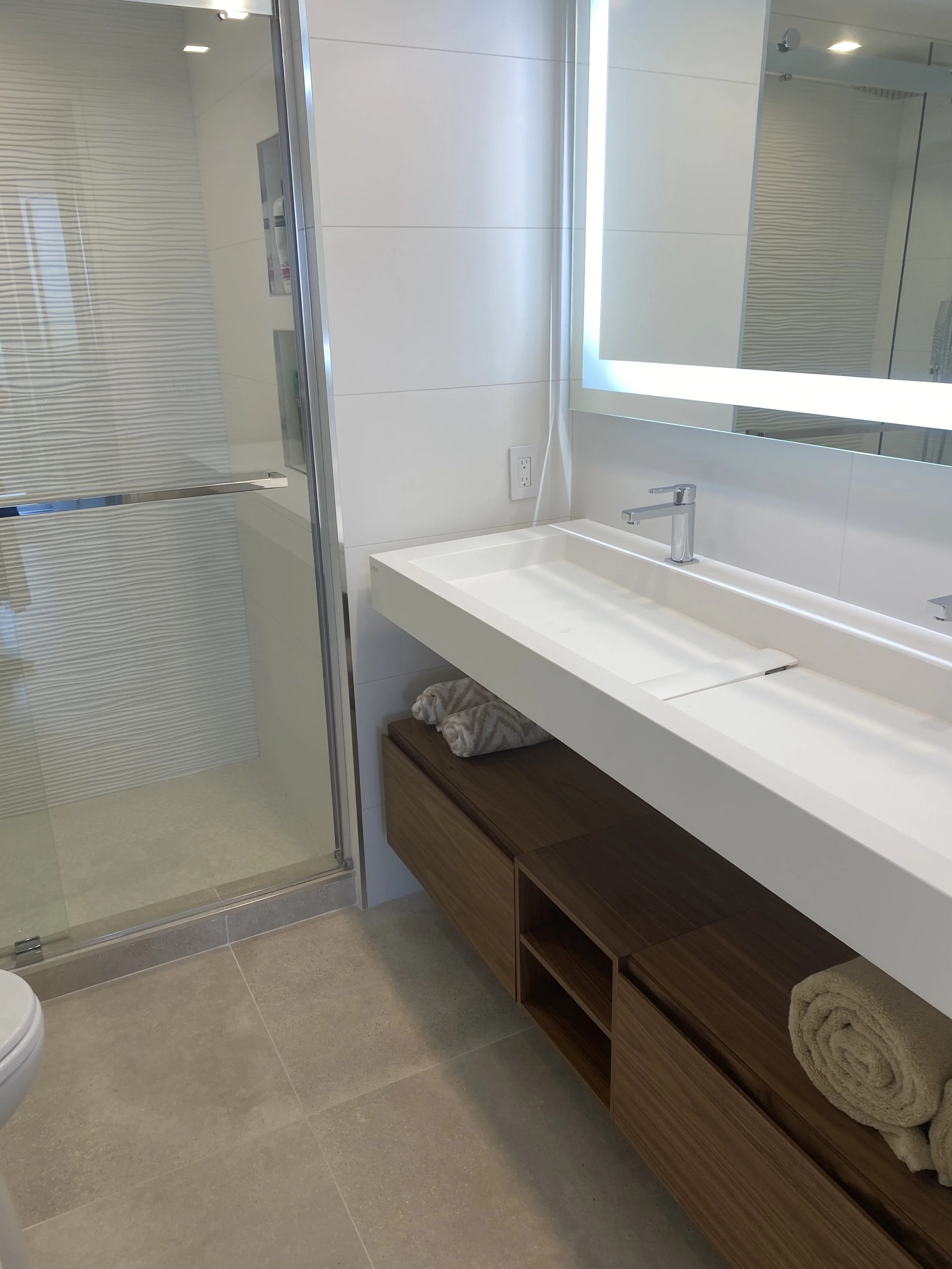 The guest bathroom keeps with the theme of the master bathroom and features beautiful wood cabinets and white countertops.