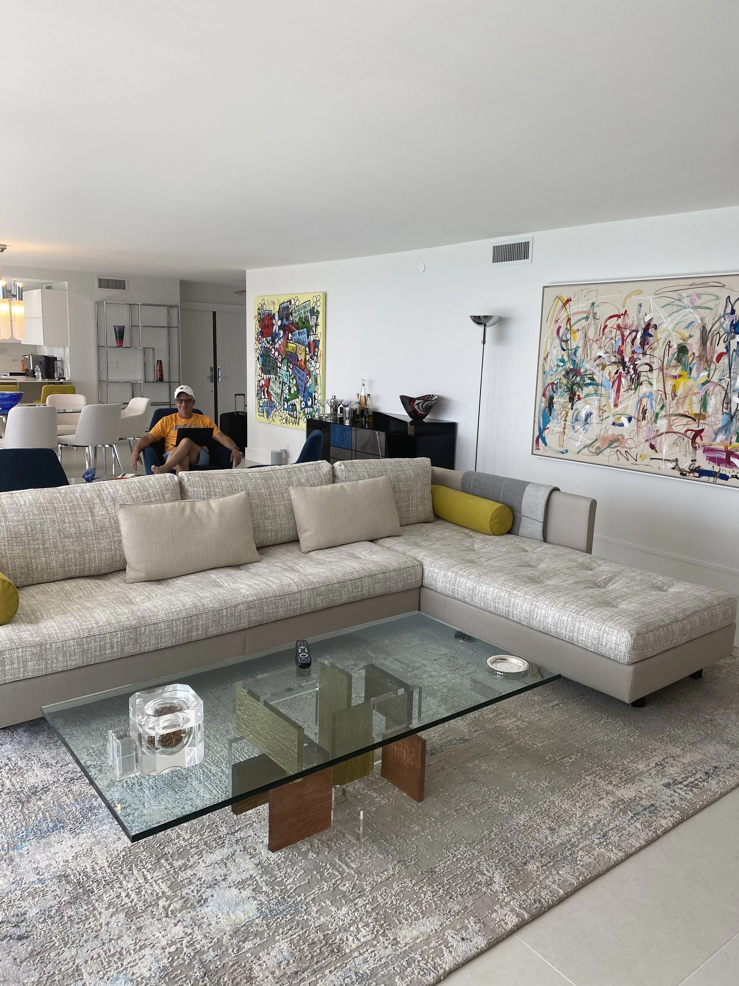 The open-plan living room & dining room creates multiple entertainment spaces in this bright, airy apartment. The glass-topped tables and blue chairs reflect the beautiful vista of the ocean right outside the floor-to-ceiling windows.