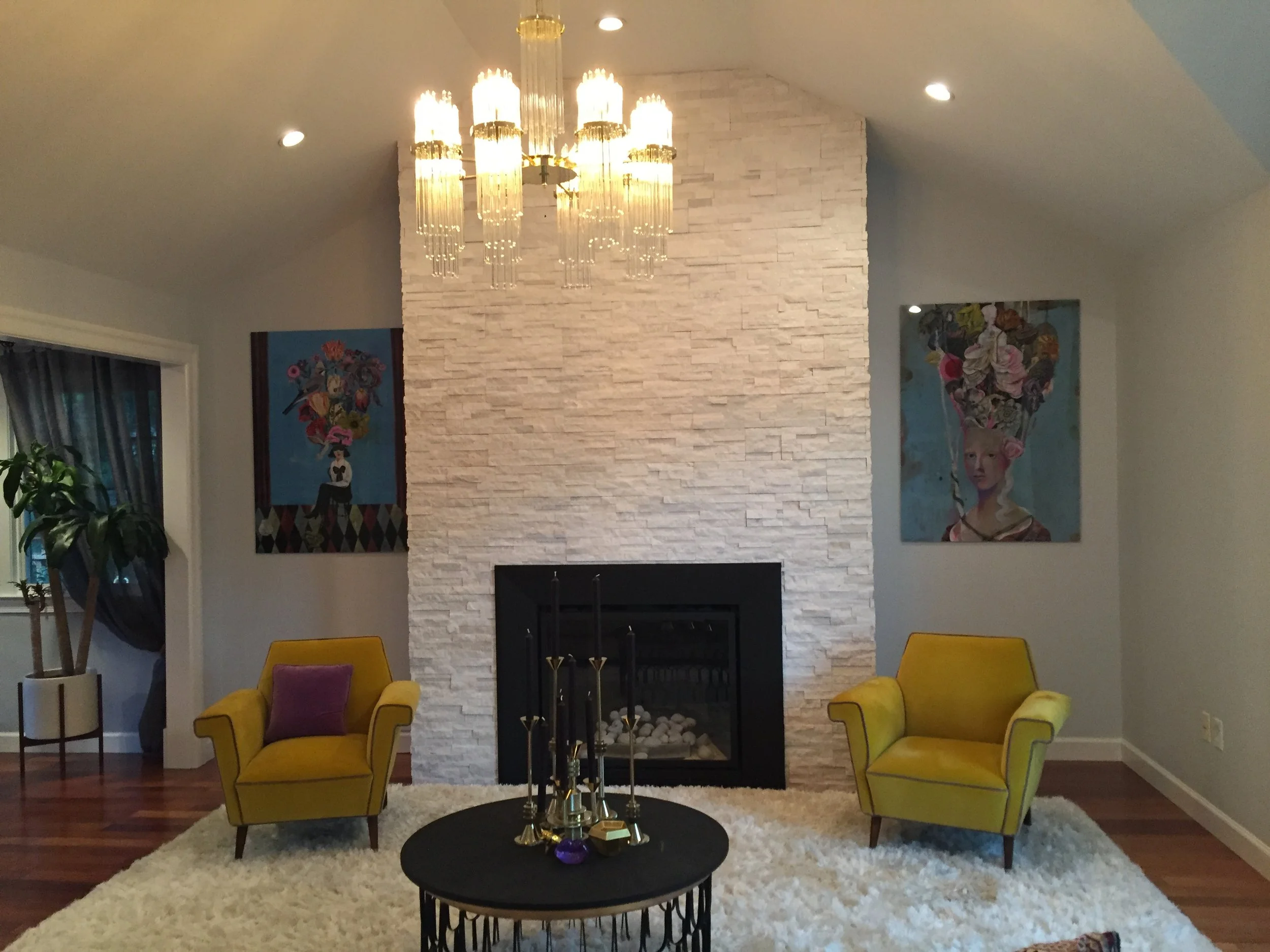 The focal point of this living room is undoubtedly the fireplace flanked by two colorful paintings. Complimenting yellow armchairs keep the eyes traveling across a sumptuous shag rug. Finally, an ornate crystal chandelier crowns this dramatic yet fun living room.