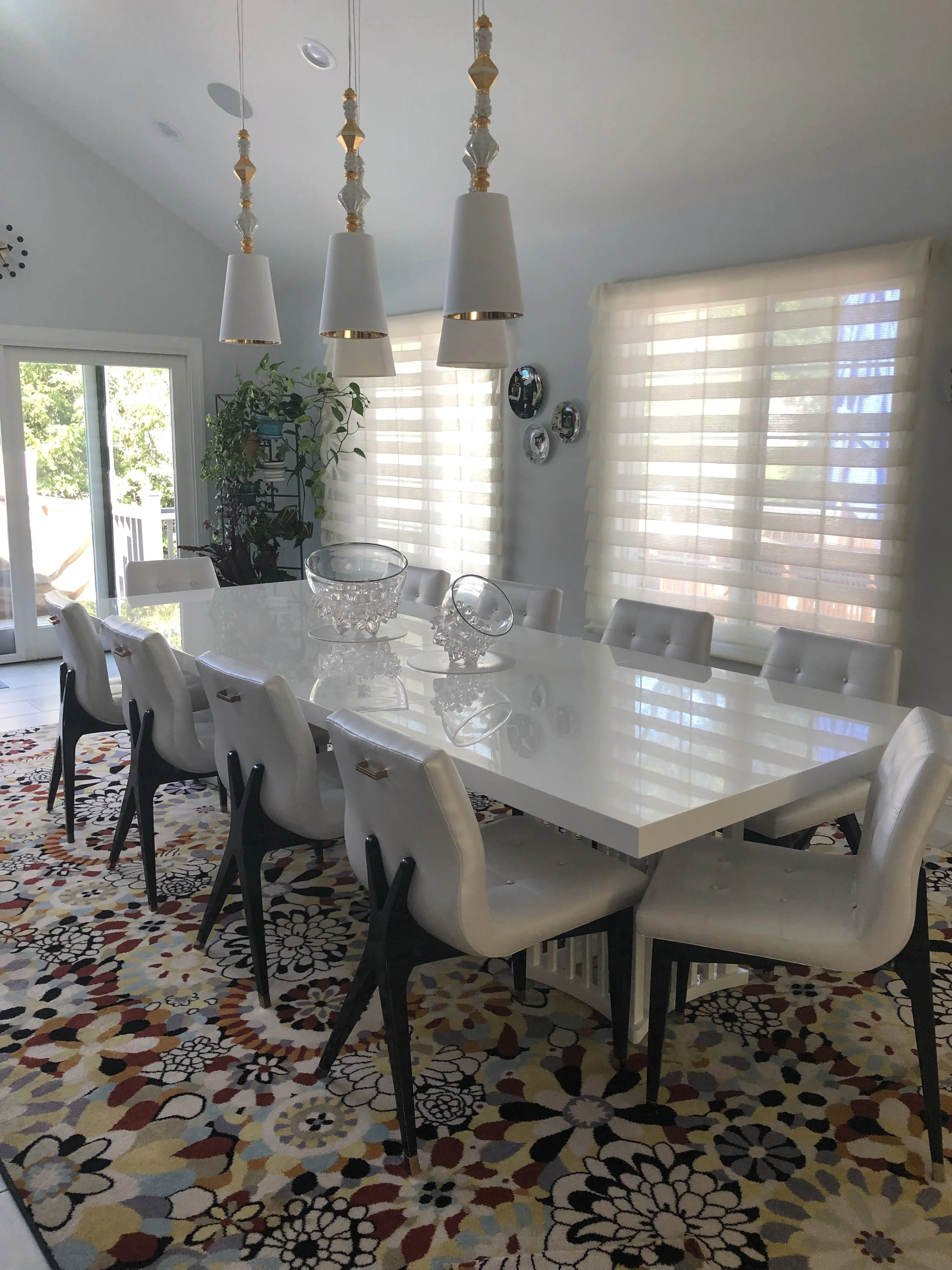 A white table, surrounded by white leather chairs center the dining room. A beautiful floral-print carpet brings life, fun and color. Individual pendants create an element of whimsy to top-off this lively entertaining space.