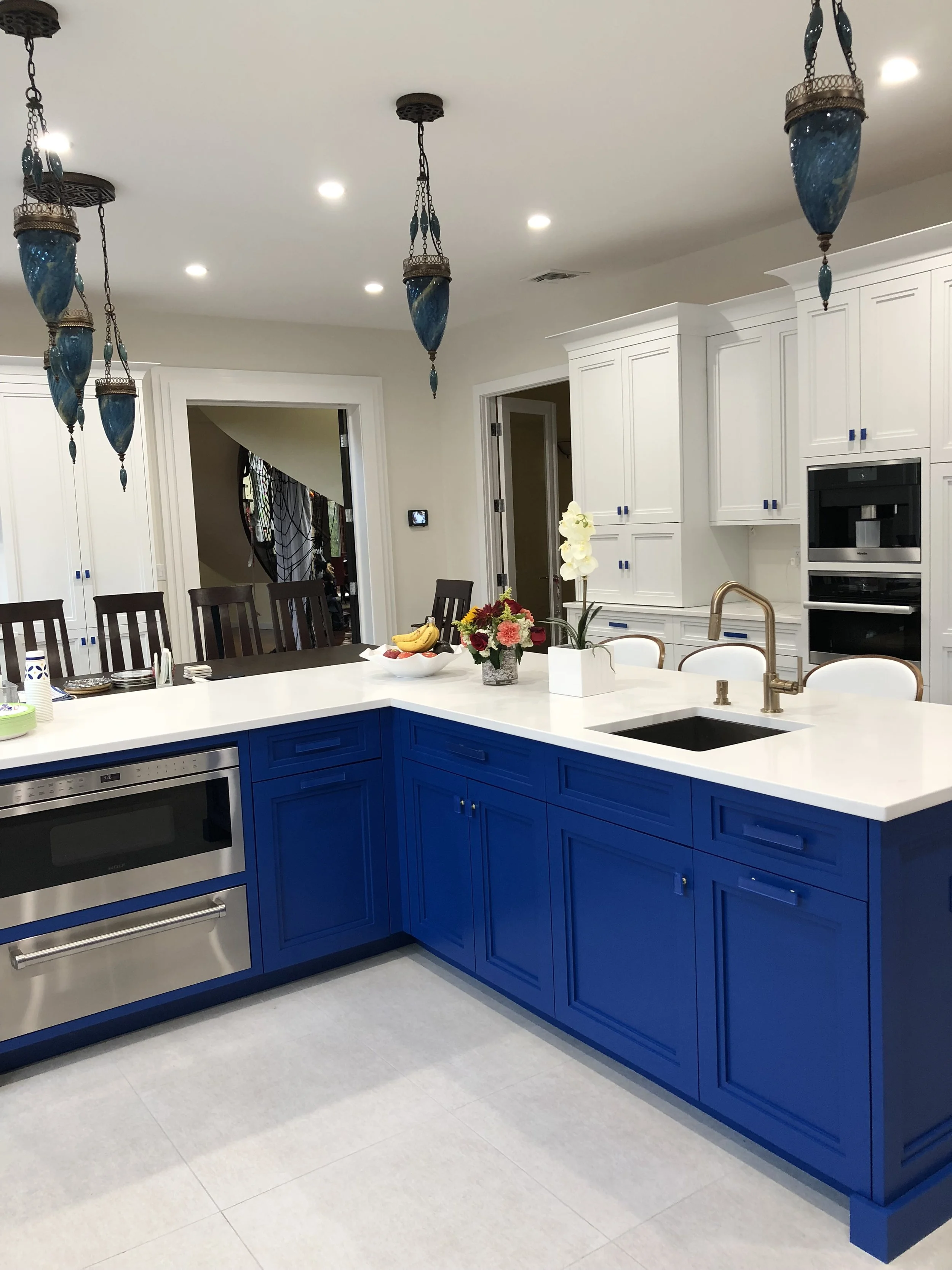 The lapis-blue bottom cabinets are off-set by the white upper cabinets, both of which feature blue knobs and handles. A beautiful blue mosaic backsplash ties the lower and the upper cabinets together. While blue pendants bejewel this exotic yet still modern kitchen.